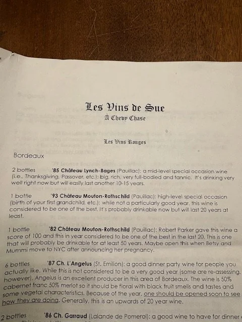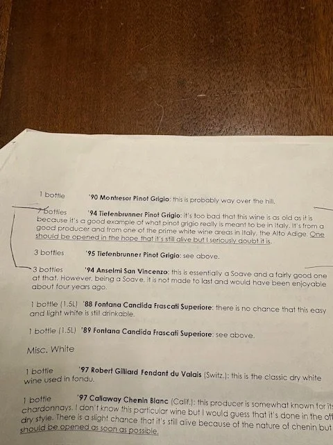 The problem is that there was never much thought given to when any of them should be consumed. About 20 years ago when she was getting ready to move I did an inventory for her. I went through each box and wrote up a quick description of the wine, where it was from, the grape/grapes and an opinion about its potential shelf life.